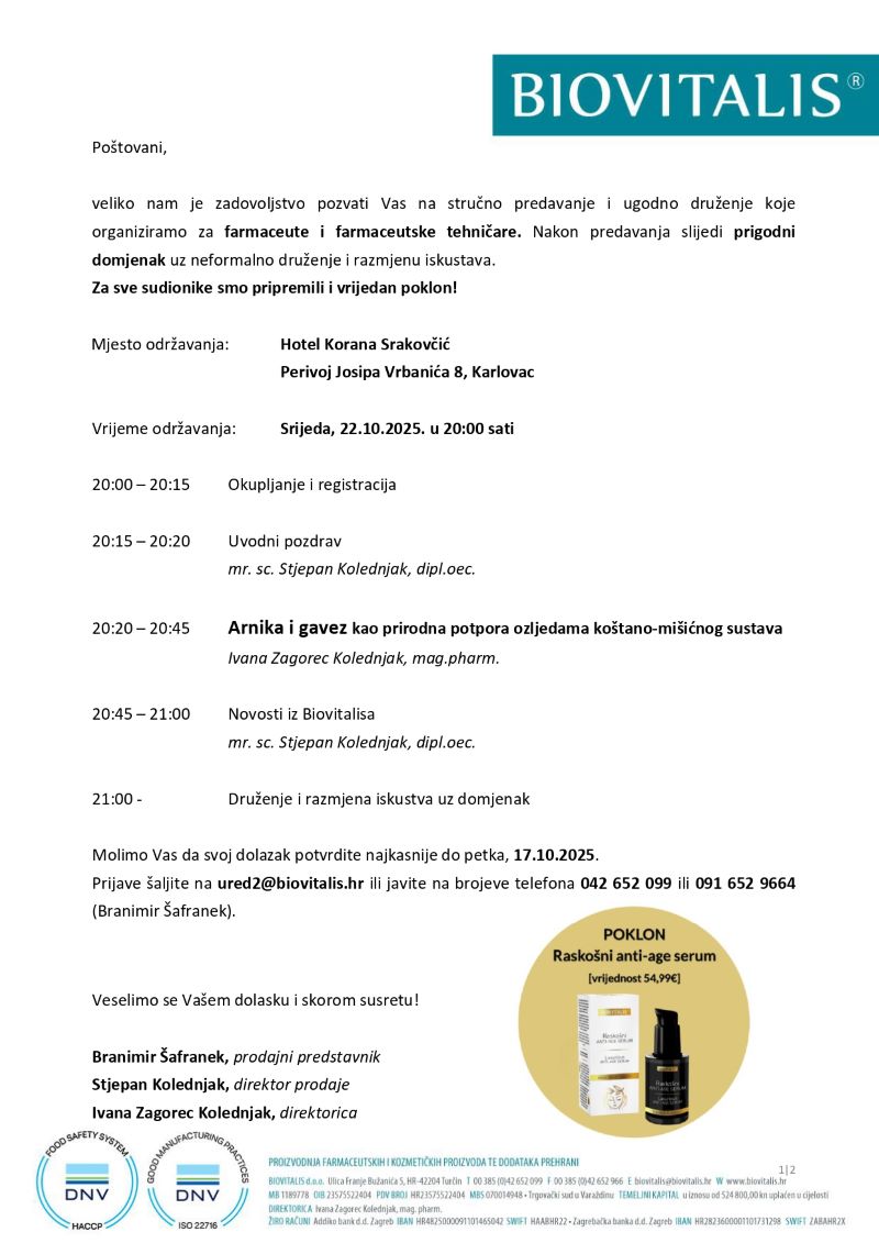 Predavanje u suradnji s tvrtkom Biovitalis d.o.o. održati će se u srijedu, 22. listopada 2025. u 20:00 sati u Hotel Korana Srakovčić, Perivoj Josipa Vrbanića 8, Karlovac.
